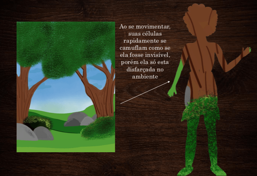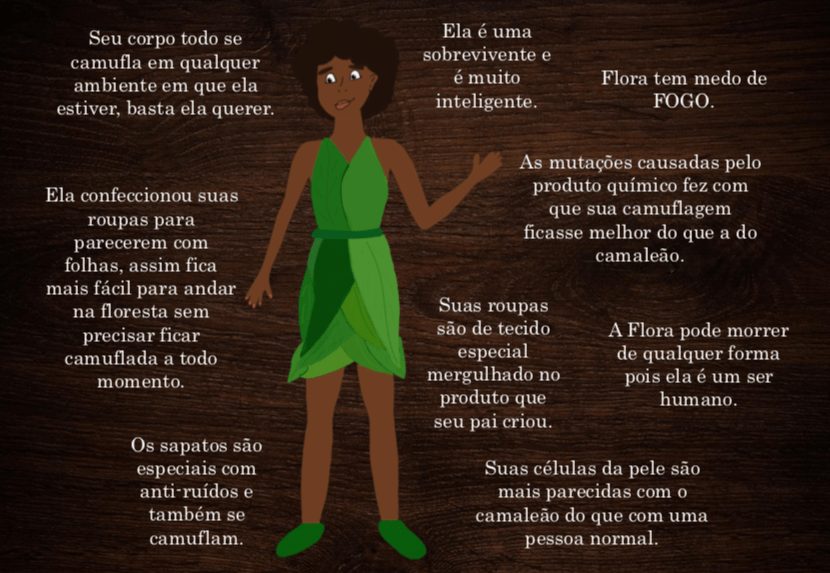 Personagem: Flora ganhou poderes ainda na sua gestação. A mãe de Flora era cientista e quando estava grávida estava estudando o poder de camuflagem do camaleão, foi quando foi exposta ao produto. Flora podia se camuflar. Um dia Flora estava brincando e homens colocaram fogo na mata, o fogo atingiu a aldeia e matou seus pais. Flora cresceu sozinha e começou a proteger a floresta com seus dons.