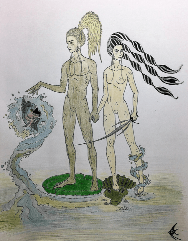 Personagem: Para salvar sua tribo de guerras, o Pagé pede ajuda dos espíritos. Os espíritos concordam e pedem dois adolescentes e duas figuras aquáticas. Com medo de sacrificar seus filhos eles decidem capturar dois adolescentes brancos e duas piranhas. As crianças da aldeia sentiram pena dos adolescentes e trocaram as piranhas por acará-bandeiras. Ao fazer o ritual, na verdade, eles não seriam sacrificados e sim ganhariam os poderes dos animais. Então ao final da transformação se tornaram dois seres mágicos, ganharam escamas metálicas e uma incrível beleza. Foram batizados Akaraîuba e Akarauna e se tornaram os heróis da tribo.