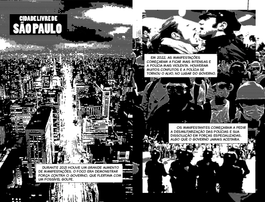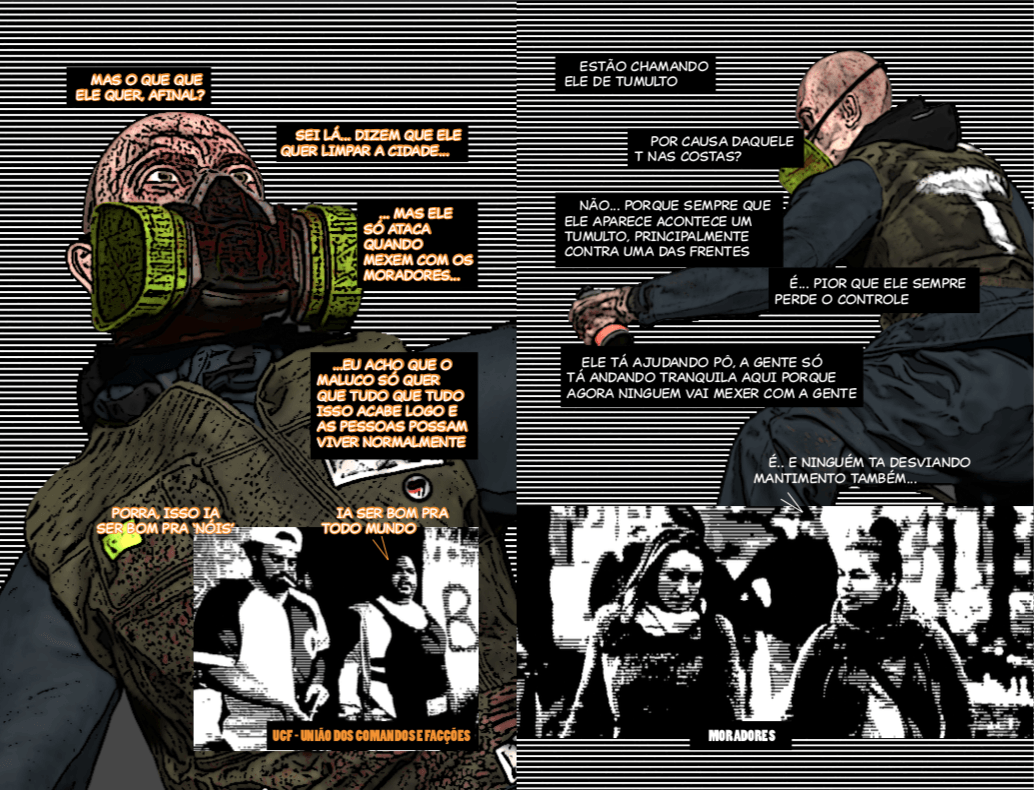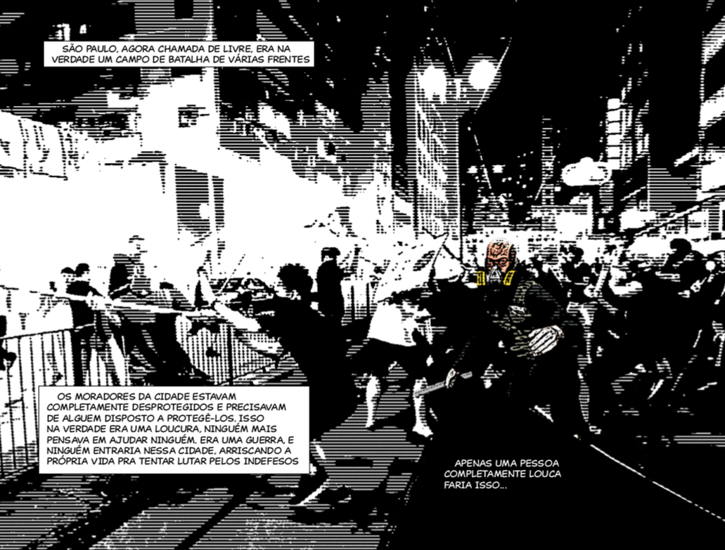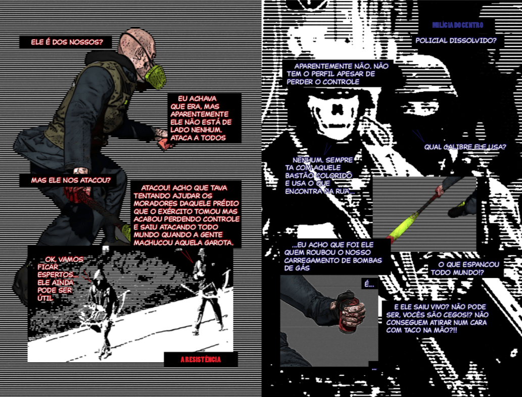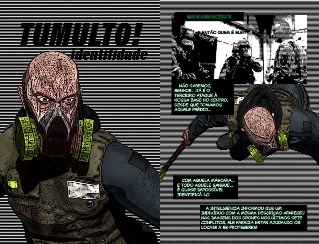 Personagem: Ainda não se sabe muito sobre "Tumulto" (como todos o chamam), mas ele começou a aparecer depois que as manifestações se tornaram verdadeiras guerras civis. Milícias e facções... ele não tem super poderes para enfrentá-los, talvez sua coragem ou loucura já sejam o suficiente, mas tudo que ele quer é ajudar a população que está cada vez mais vulnerável... e de certa forma tem dado certo.