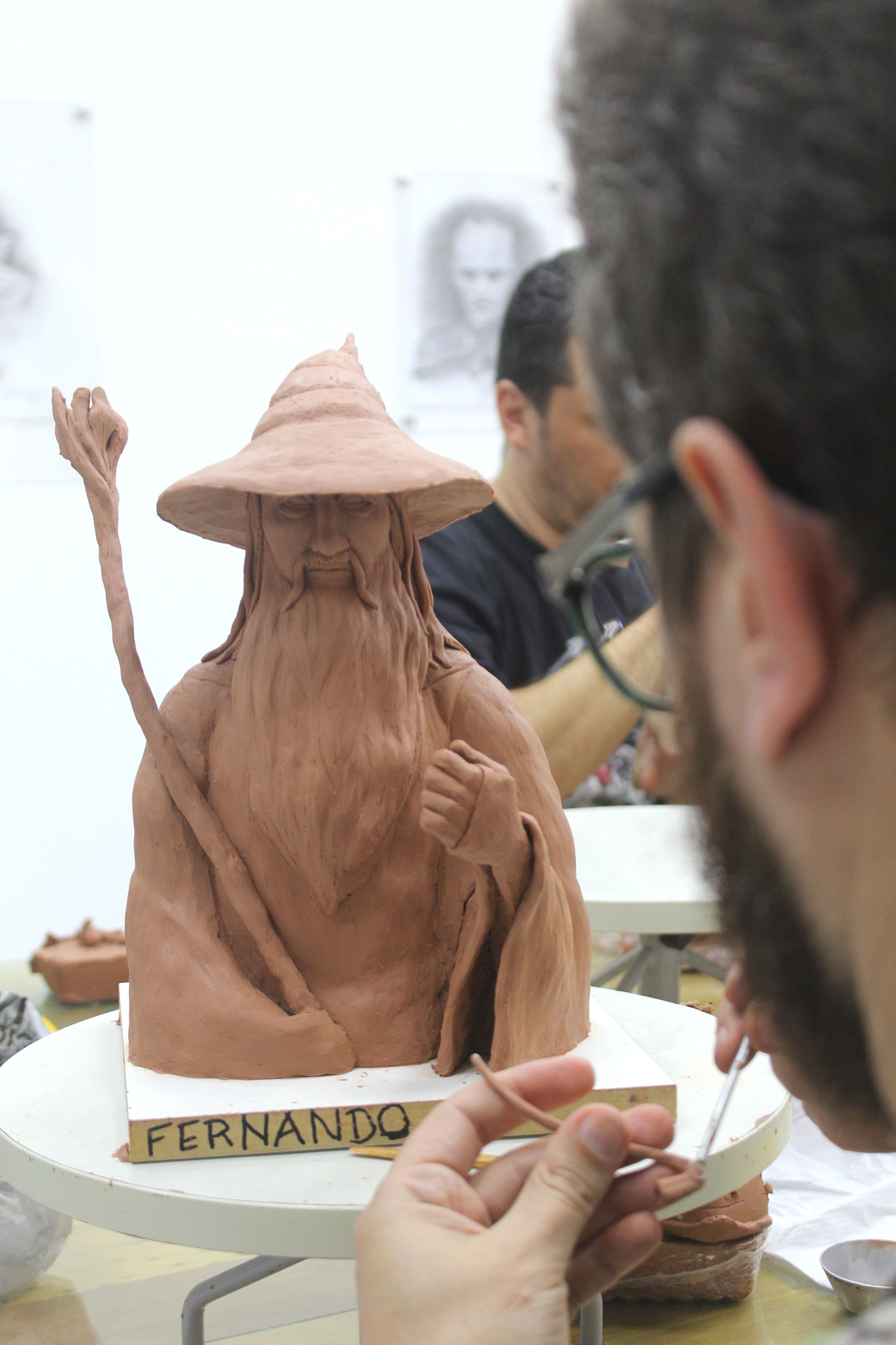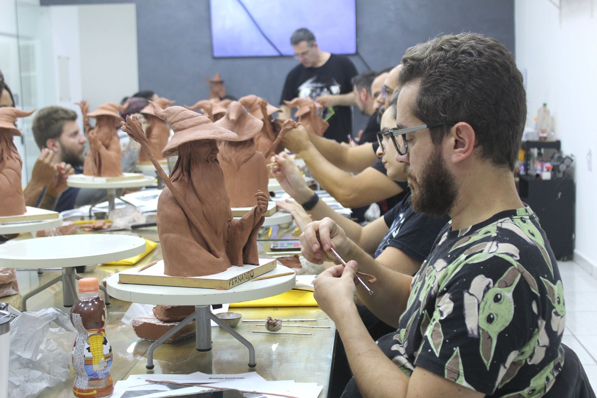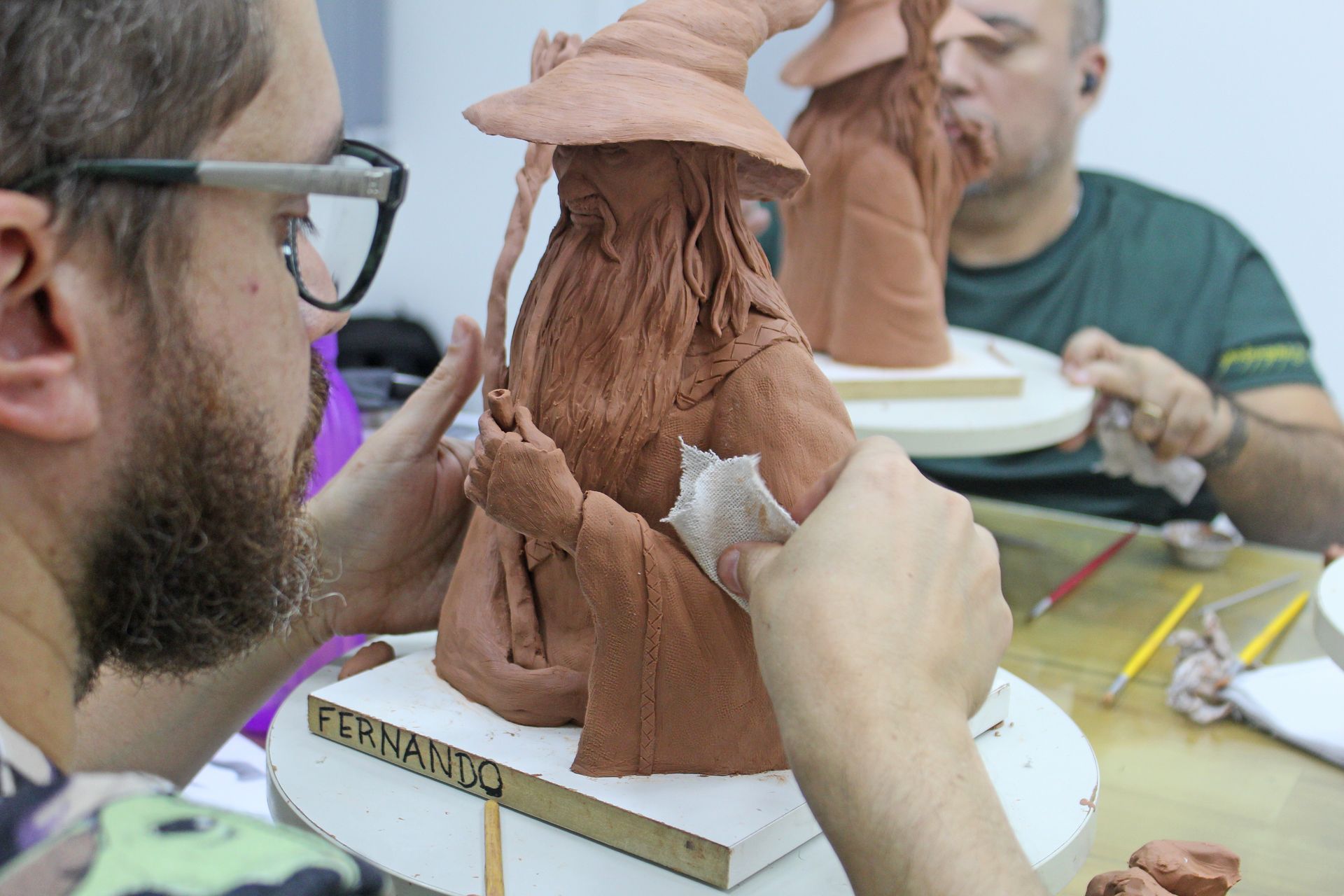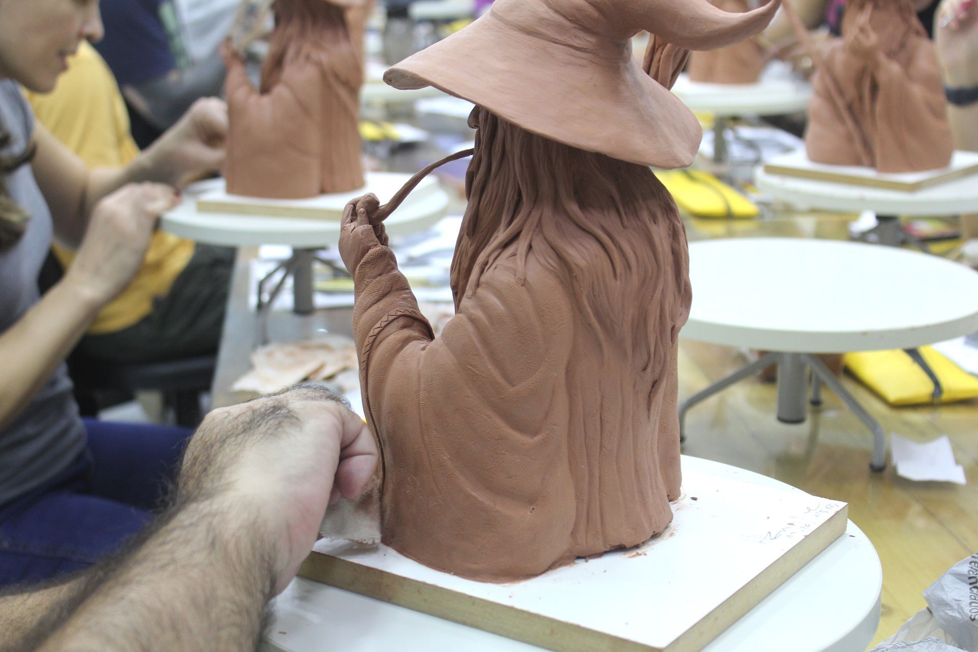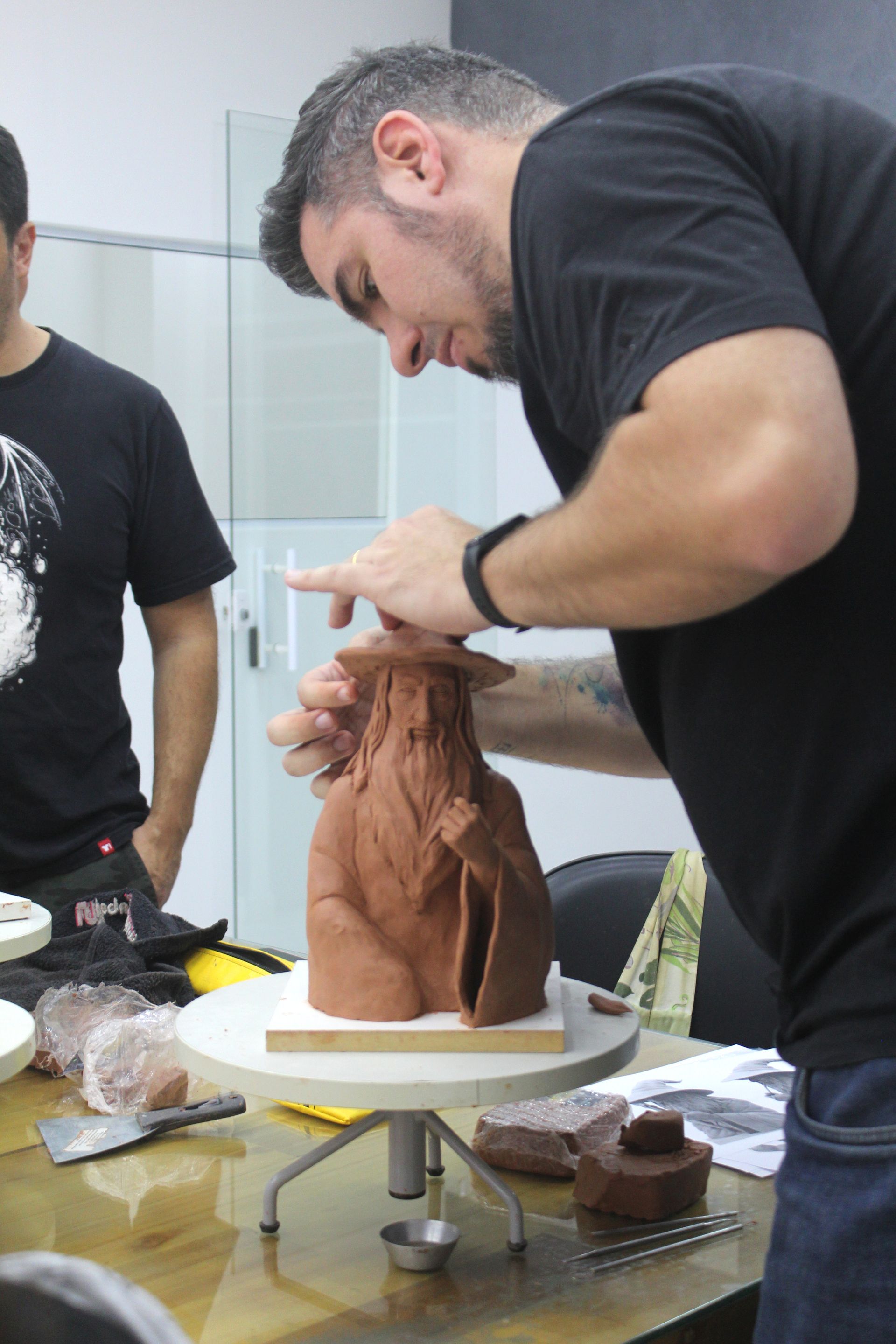 E essa foi a segunda turma do Workshop do Gandalf! Alguns alunos voltaram para aprender as peculiaridades deste personagem. Outros vieram ao nosso Studio pela primeira vez. Alguns iniciantes e outros já modelavam em outros materiais como argila e biscuit. Sempre existe uma troca de informações e experiências, me sinto sempre renovado, pois também gosto de aprender com meus alunos! Foram dois dias e meio muito divertidos! É cansativo... puxado... mas com certeza damos boas risadas no processo. Muito obrigado a todos os alunos que participaram, agradeço a dedicação e por confiarem no nosso trabalho! As esculturas ficaram muito bonitas! Parabéns galera! Agradeço a minha equipe, que está sempre pronta para me ajudar! Cendy Polcaro, Dany Dje e João Fernandes. Com vocês tudo fica mais fácil e divertido. Os alunos produziram a escultura do Gandalf em plastilina soft do Maya Clay. Abaixo você pode ver um pouco das fotos do processo.