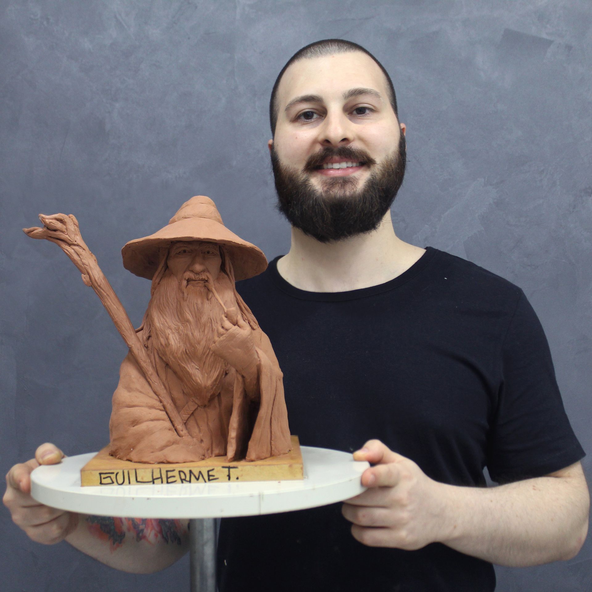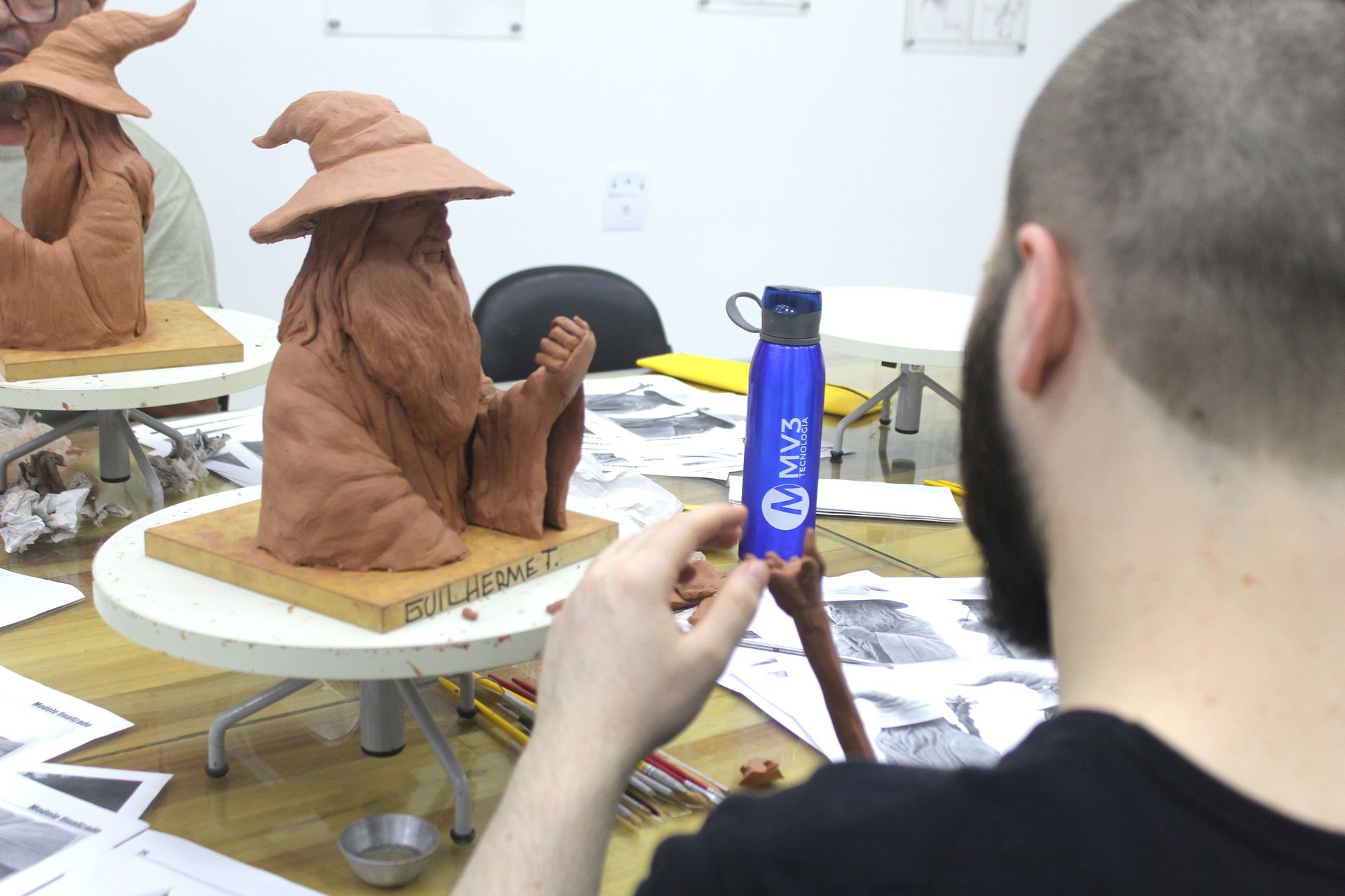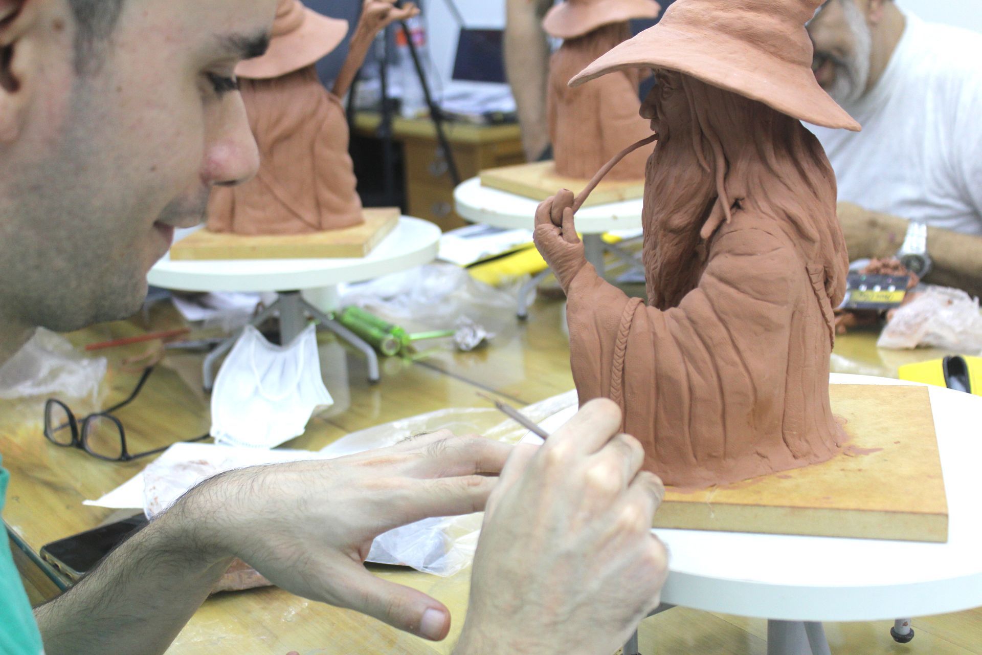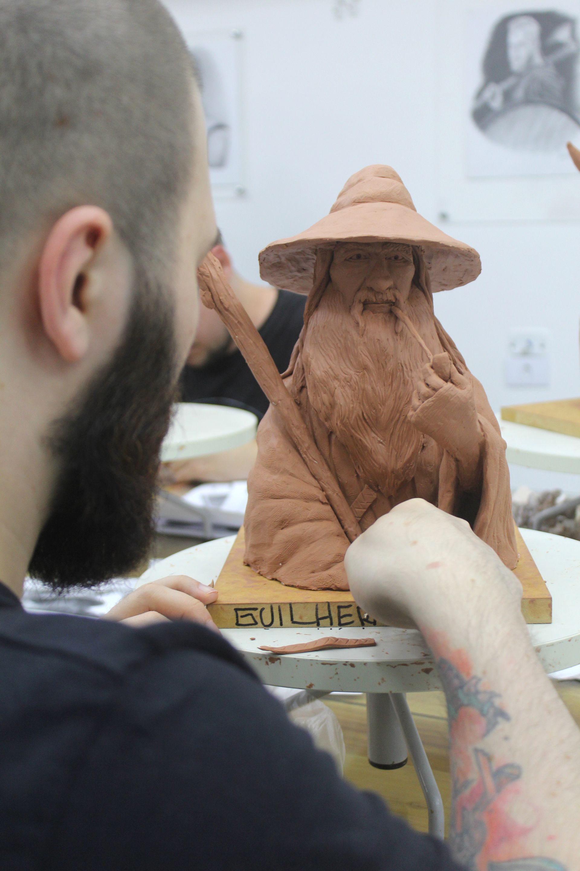 Os alunos produziram a escultura do Gandalf em plastilina soft do Maya Clay.