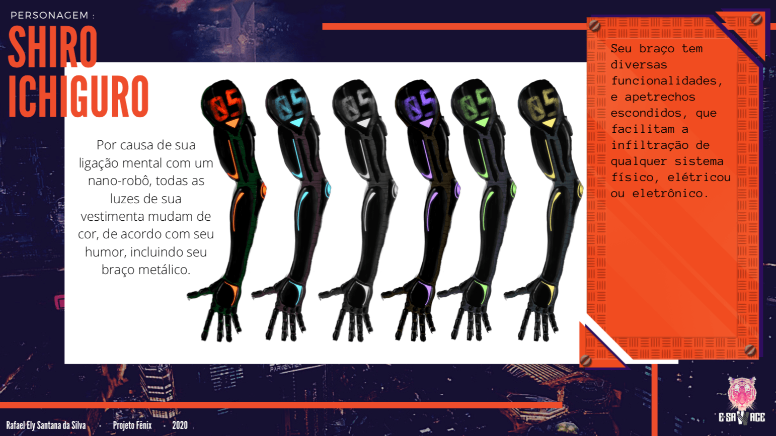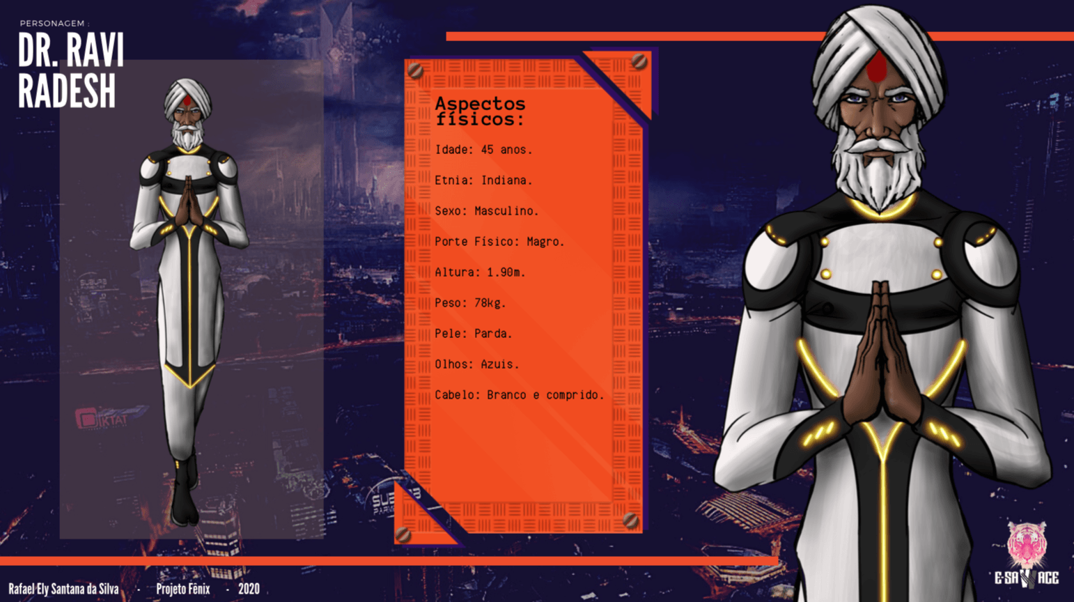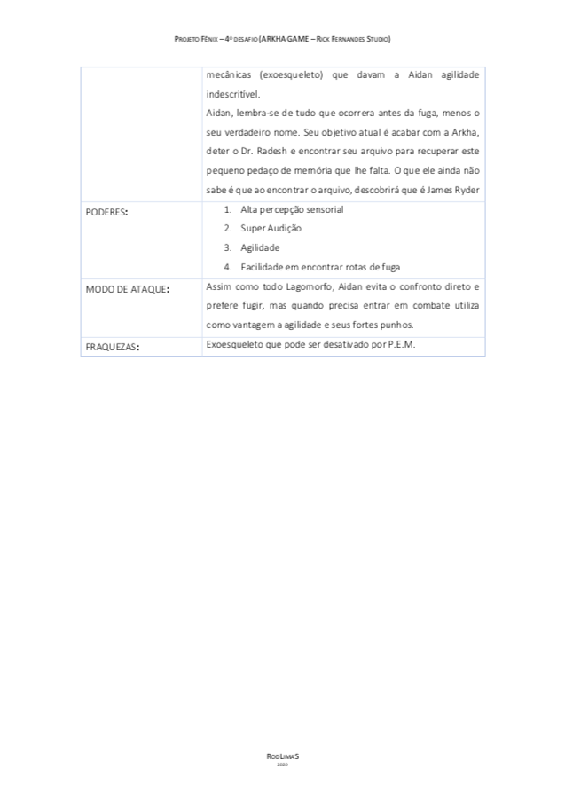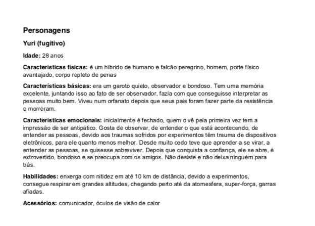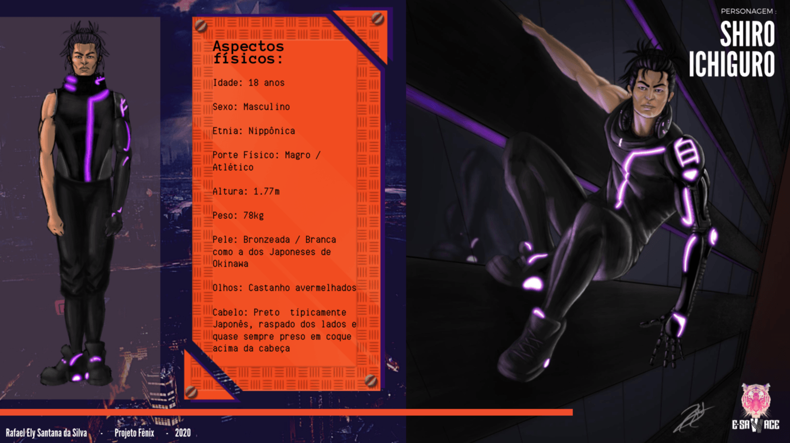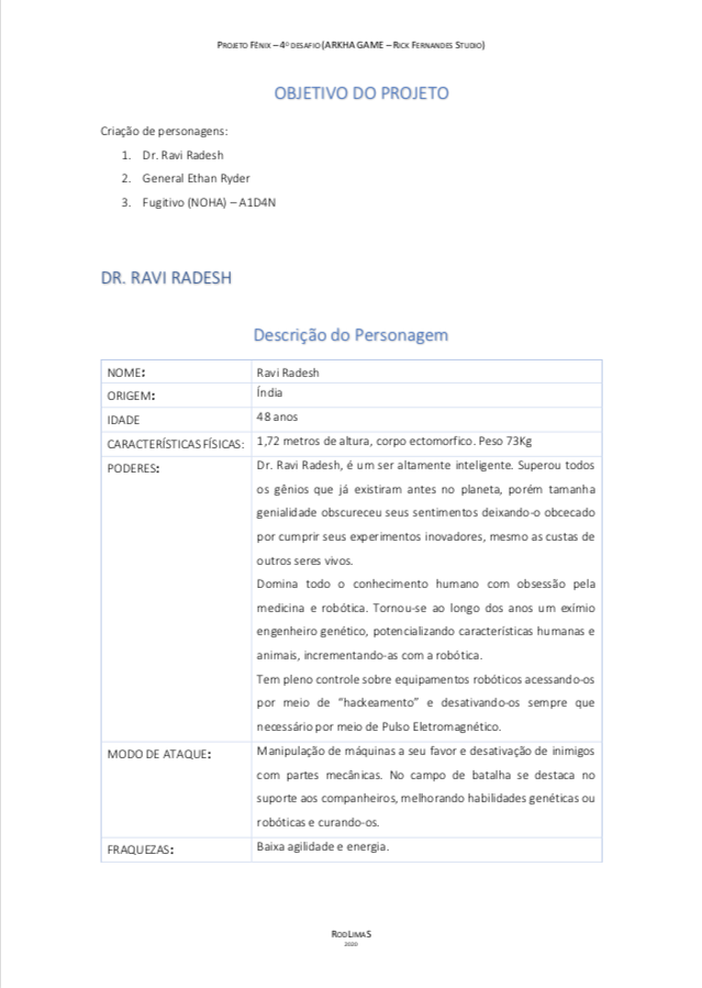 O quarto e último desafio do nosso projeto Fênix foi desenvolver personagens para um jogo futurista, imaginar o futuro (cultura, roupas, transporte, ambiente e etc.. ) também é um ótimo exercício de criatividade, pois apesar de existirem inúmeras especulações sobre, ainda não sabemos como serão as coisas de fato, e essa também é uma ótima reflexão, ainda mais agora, com tudo que estamos vivendo, temos que aprender alguma lição com essa experiência de Pandemia para poder melhorar.